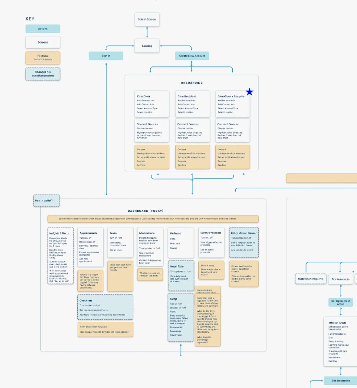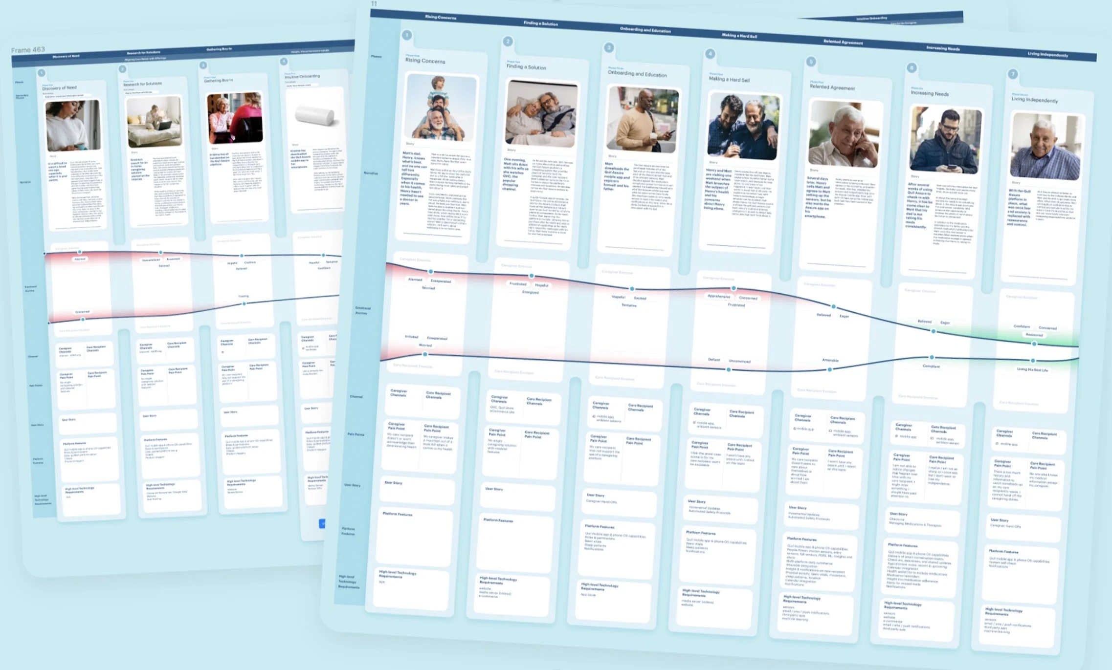 We used user research to create personas and detailed user journeys from initial stories. We developed and tested 9 concepts with caregivers and recipients, resulting in three journey maps. A cohort of 40 users was maintained for continuous testing and refinement throughout our partnership.