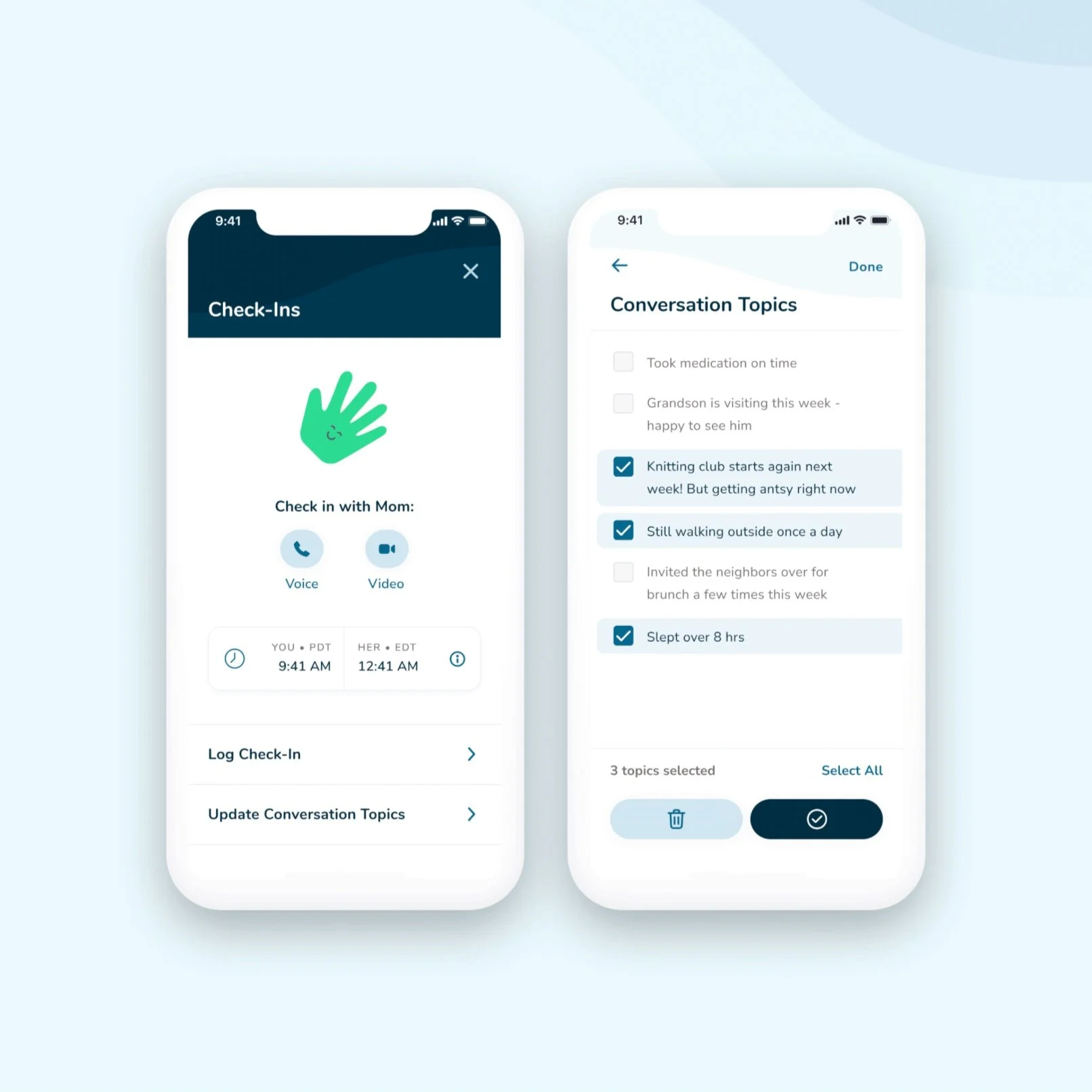 All members of the care circle can use this feature to check in with their care recipients. This allows users to share the responsibility of logging notes and updating conversation topics related to insights, appointment and overall wellbeing related topics.