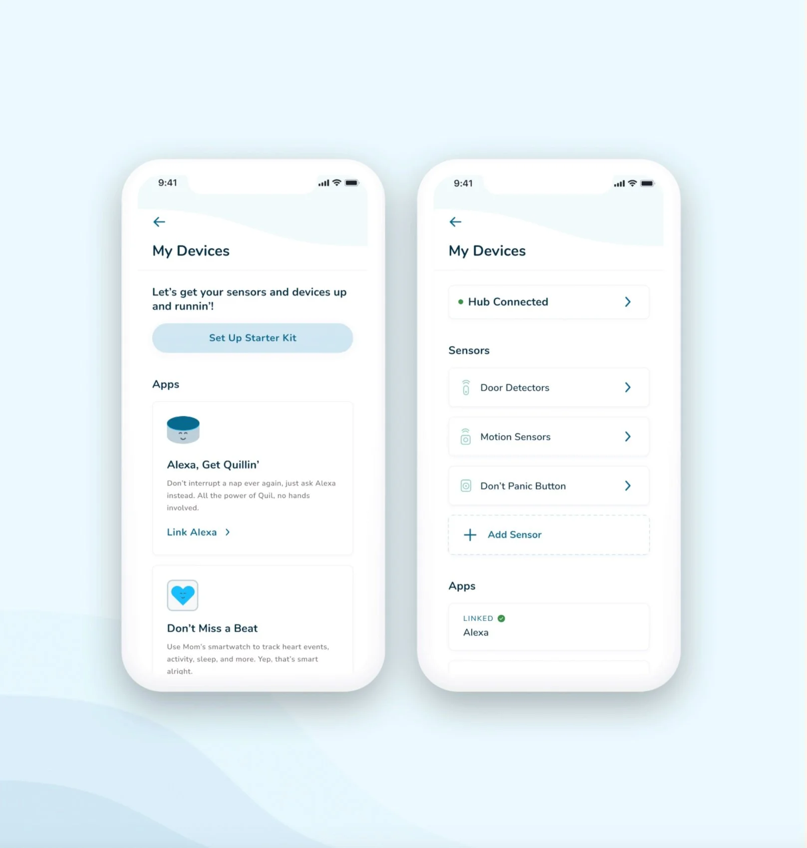 Quil incorporates smart sensors such as Apple Watch, Alexa, Door detectors, smart sensors, panic buttons to keep recipients safe.